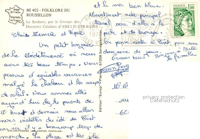 13255398 carte postale Roussillon La Sardane par le Groupe des Danseurs Catalans d’Amelie les Bains postalisch gelaufen Erhaltung siehe scans [WerneD78] KatCode: 11170066266136