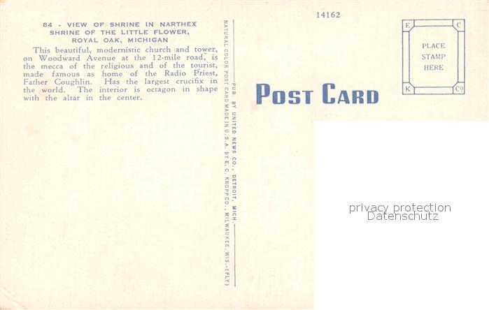 73127805 Royal Oak Michigan Shrine in Narthex Shrine of the little Flower postalisch nicht gelaufen Erhaltung siehe scans [KathaD81] KatCode: 14140240000000