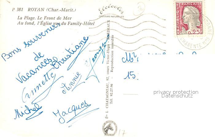 13494955 carte postale Royan 17 La Plage Front de Mer Eglise vue du Family Hotel postalisch gelaufen Erhaltung siehe scans [FriedD77] KatCode: 11170017386194