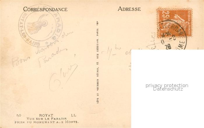 13534471 carte postale Royat Puy de Dome Vue sur le Paradis prise du Monument aux Morts postalisch gelaufen Erhaltung siehe scans [FriedD77] KatCode: 11170063263308