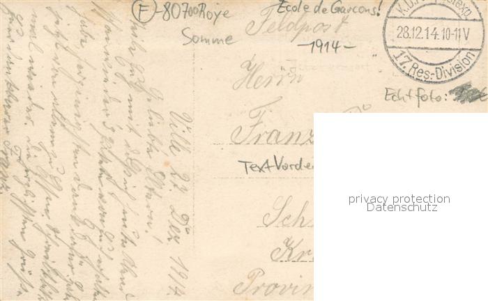 13748678 Roye Somme 80 Ecole de Garcons postalisch gelaufen Feldpostexpedition (Stempel) Erhaltung siehe scans [WerneD78] Feldpostexpedition (Stempel) carte postale Wern Katcode 11170080380685