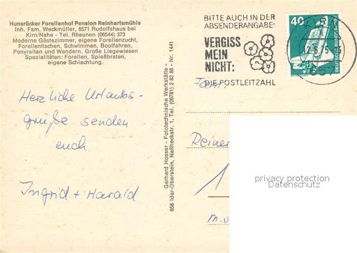 73667592 alte Postkarte Rudolfshaus Nahe Hunsruecker Forellenhof Pension Reinhartsmuehle Fliegeraufnahme postalisch gelaufen Erhaltung siehe scans [FriedD77] KatCode: 11110007133052