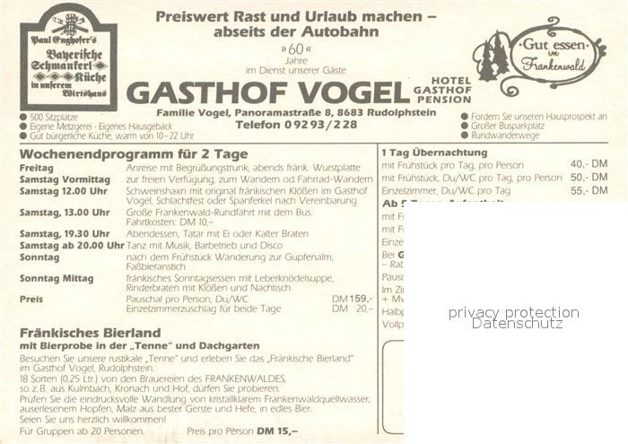 73645708 Rudolphstein Hotel Pension Vogel im Naturpark Frankenwald Saaletal postalisch nicht gelaufen Werbekarte (keine Postkarte) Erhaltung siehe scans [FriedD77] KatCode: 11110009475113
