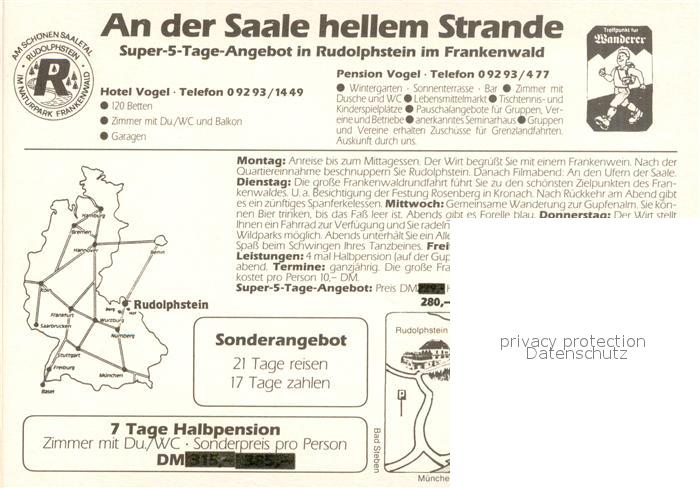73645783 Rudolphstein Hotel Pension Vogel im Naturpark Frankenwald Saaletal postalisch nicht gelaufen Werbekarte (keine Postkarte) Erhaltung siehe scans [FriedD77] KatCode: 11110009475113