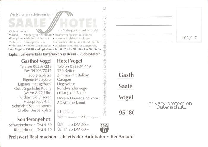 72481805 Rudolphstein Saale Hotel Gasthof Vogel postalisch nicht gelaufen Werbekarte (keine Postkarte) Erhaltung siehe scans KatCode: 11110009475113