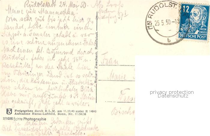 73770892 alte Postkarte Rudolstadt Fliegeraufnahme mit Schloss postalisch gelaufen Erhaltung siehe scans [WerneD78] KatCode: 11110016073076