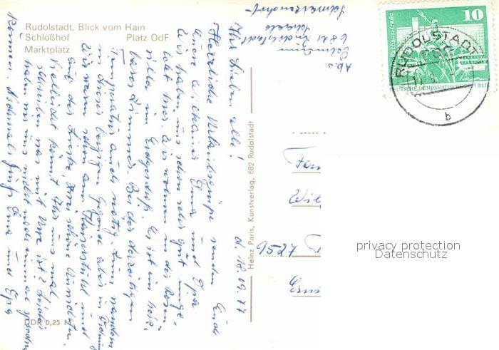 72703367 alte Postkarte Rudolstadt Panorama Blick vom Hain Schlosshof Platz OdF Denkmal Marktplatz postalisch gelaufen Erhaltung siehe scans [FriedD77] KatCode: 11110016073076