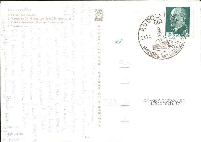 72411485 alte Postkarte Rudolstadt Schloss Heidecksburg Marktplatz Volkskundemuseum Marktbrunnen postalisch gelaufen Erhaltung siehe scans KatCode: 11110016073076