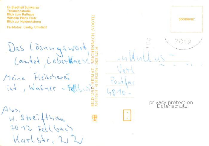 73814939 alte Postkarte Rudolstadt Thaelmannstrasse Blick zum Rathaus Wilhelm Pieck Platz Heidecksburg postalisch gelaufen Erhaltung siehe scans [WerneD78] KatCode: 11110016073076