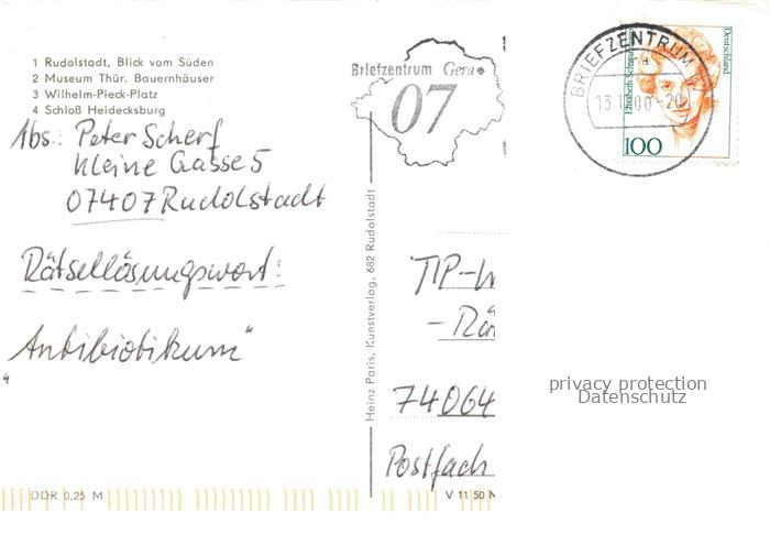 74099484 Rudolstadt Thueringen Panorama Museum Thuer Bauernhaeuser Wilh Pieck Platz Schloss Heidecksburg postalisch gelaufen Erhaltung siehe scans [WerneD78] alte Postkarte Wern Katcode 11110016073076