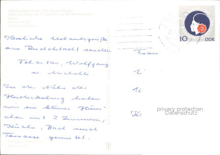 72374738 alte Postkarte Rudolstadt Thueringer Bauernhaeuser Heidecksburg Portal der 5 Tugenden Markt Stadtteil Schwarza postalisch gelaufen Erhaltung siehe scans KatCode: 11110016073076
