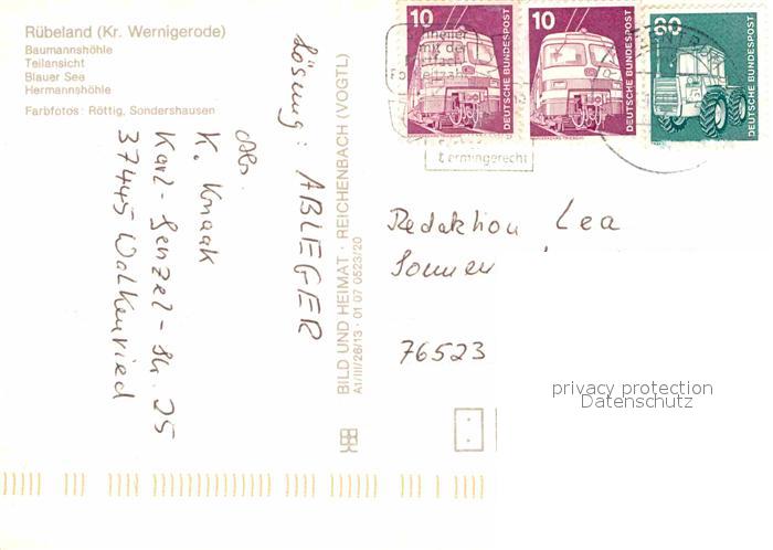 72904565 alte Postkarte Ruebeland Harz Baumannshoehle Blauer See Hermannshoehle postalisch gelaufen Erhaltung siehe scans [FriedD77] KatCode: 11110015085100