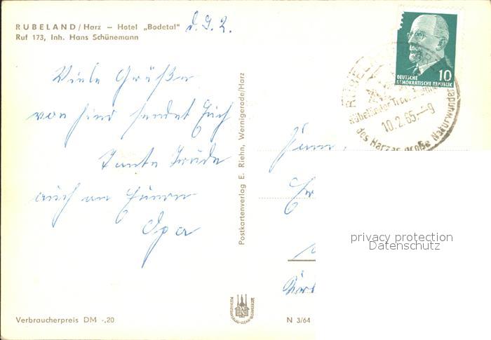 72073661 alte Postkarte Ruebeland Harz Hotel Bodetal postalisch gelaufen Erhaltung siehe scans KatCode: 11110015085100