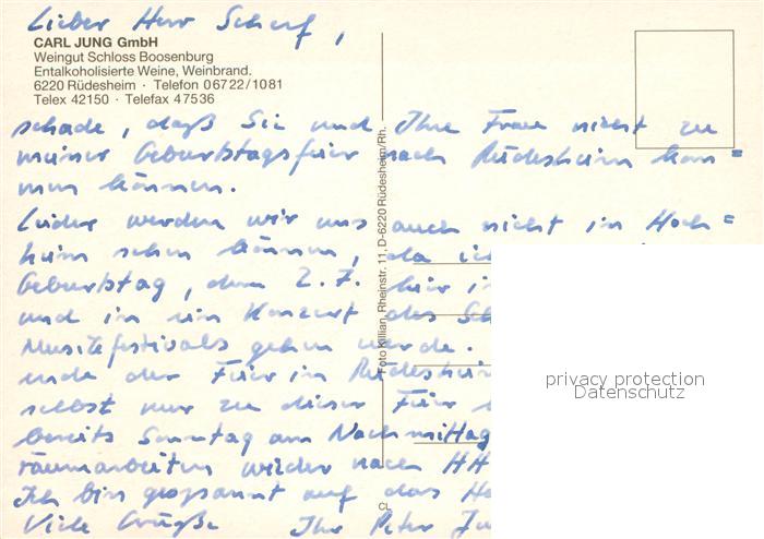 73743685 Ruedesheim am Rhein Carl Jung GmbH Weingut Schloss Boosenburg postalisch nicht gelaufen Erhaltung siehe scans [FriedD77] KatCode: 11110006439013