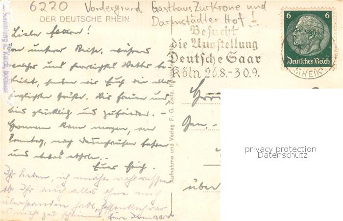 73697345 alte Postkarte Ruedesheim am Rhein Gasthaus Zur Krone und Darmstaedter Hof Rheinstrasse postalisch gelaufen Erhaltung siehe scans [LiesaD40] KatCode: 11110006439013