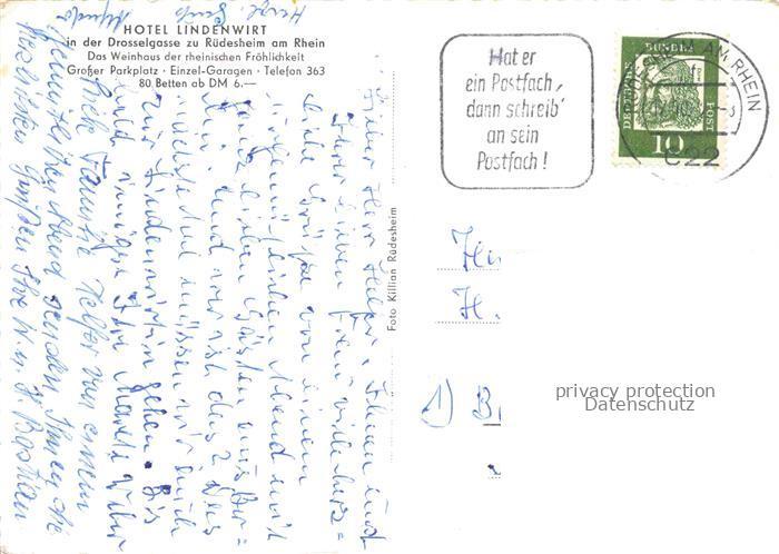 74040699 alte Postkarte RueDESHEIM am Rhein Hotel Lindenwirt Restaurant postalisch gelaufen Erhaltung siehe scans [FriedD77] KatCode: 11110006439013