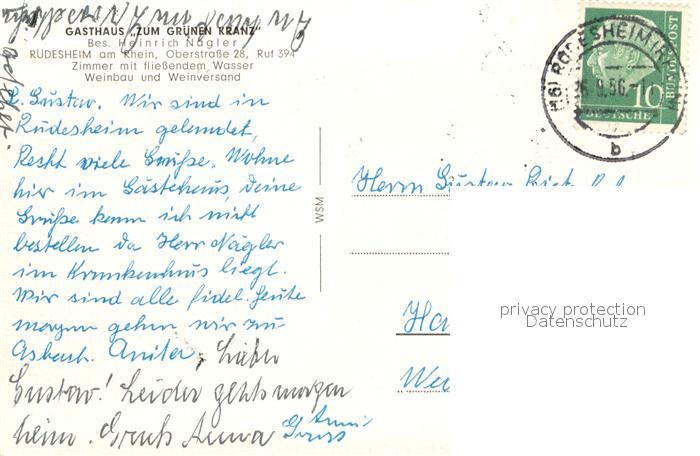 73714118 alte Postkarte Ruedesheim am Rhein National Denkmal Gasthaus zum gruenen Kranz Maeuseturm Ruine Ehrenfels Burg Rheinstein postalisch gelaufen Erhaltung siehe scans [WerneD78] KatCode: 11110006439013