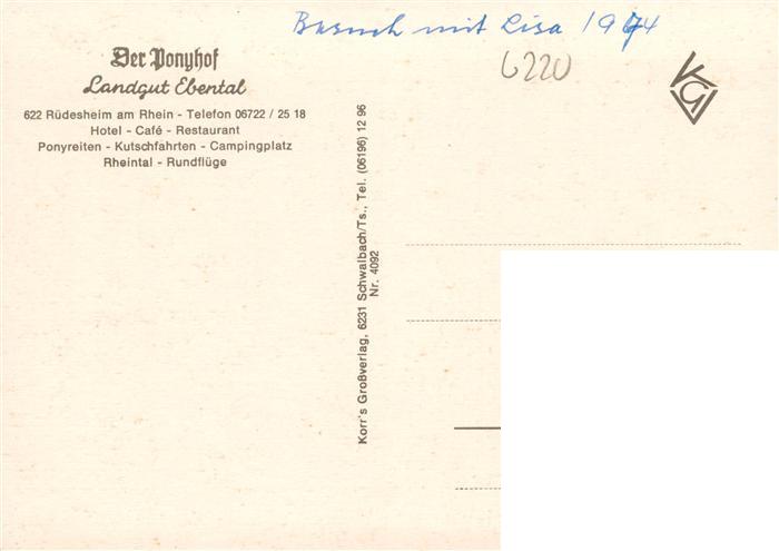 73936541 alte Postkarte Ruedesheim am Rhein Ponyhof Landgut Ebental Panorama Terrasse Flugplatz postalisch gelaufen Erhaltung siehe scans [FriedD77] KatCode: 11110006439013