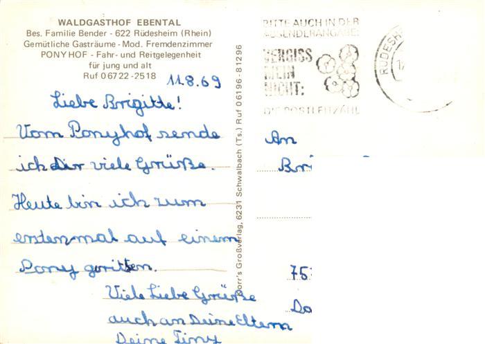 73935983 alte Postkarte Ruedesheim am Rhein Waldgasthof Ebental Ponyhof Fahr und Reitgelegenheit postalisch gelaufen Erhaltung siehe scans [FriedD77] KatCode: 11110006439013