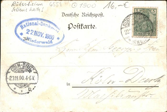 41312718 alte Postkarte Ruedesheim National Denkmal seltene Karte postalisch gelaufen gute Erhaltung KatCode: 11110006439013