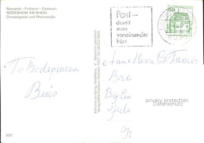 72310223 alte Postkarte Ruedesheim Rhein Drosselgasse Rheinstrasse Faehre postalisch gelaufen Erhaltung siehe scans KatCode: 11110006439013