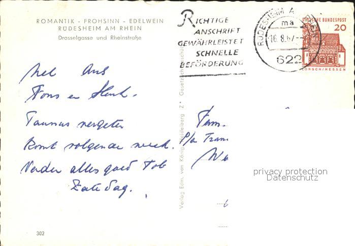 72430350 alte Postkarte Ruedesheim Rhein Drosselgasse und Rheinstrasse postalisch gelaufen Erhaltung siehe scans KatCode: 11110006439013