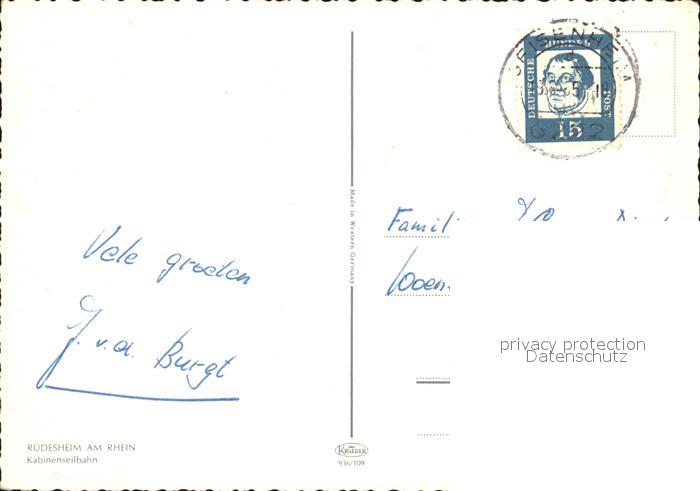 72049051 alte Postkarte Ruedesheim Rhein Kabinenseilbahn Panorama postalisch gelaufen Erhaltung siehe scans KatCode: 11110006439013