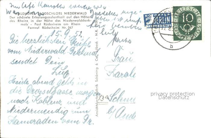72094305 alte Postkarte Ruedesheim Rhein Waldhotel Jagdschloss Niederwald Nationaldenkmal postalisch gelaufen Erhaltung siehe scans KatCode: 11110006439013