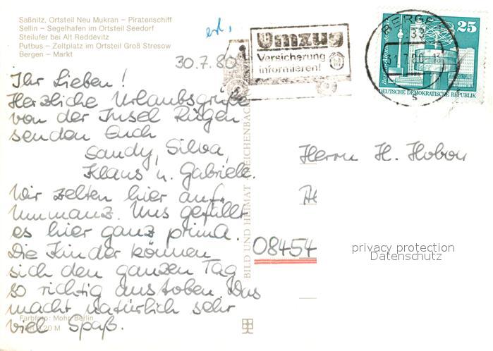 73159004 alte Postkarte Ruegen Neu Mukran Piratenschiff Sellin Putbus Bergen Markt postalisch gelaufen Erhaltung siehe scans [KathaD81] KatCode: 11110013061004