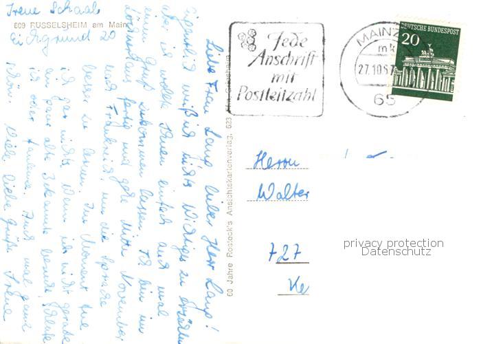 73830677 alte Postkarte Ruesselsheim Main Stadion Marktplatz Frankfurter Strasse Gabelsberger Platz Teilansicht Friedensbrunnen Krankenhaus Rathaus postalisch gelaufen Erhaltung siehe scans [FriedD77] KatCode: 11110006433012