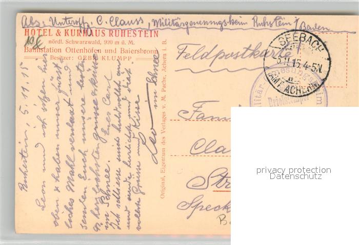 43498584 Ruhestein Baiersbronn BW Hotel Kurhaus postalisch gelaufen Feldpostamt (Stempel) Erhaltung siehe scans [KathaD81] Feldpostamt (Stempel) alte Postkarte Kath Katcode 11110008237004