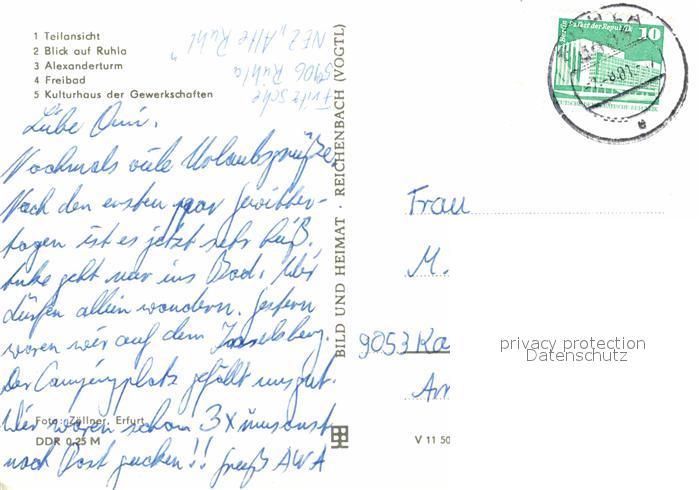 72729672 alte Postkarte Ruhla Teilansicht Alexanderturm Aussichtsturm Freibad Kulturhaus der Gewerkschaften postalisch gelaufen Erhaltung siehe scans [FriedD77] KatCode: 11110016063066