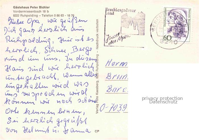 74100289 alte Postkarte Ruhpolding Bayern Gaestehaus Peter Bichler postalisch gelaufen Erhaltung siehe scans [FriedD77] KatCode: 11110009189140