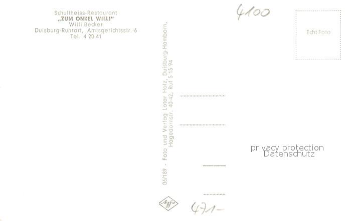 43190949 Ruhrort Schultheiss Restaurant Zum Onkel Willi Rheinbruecke postalisch nicht gelaufen Erhaltung siehe scans [FriedD77] KatCode: 11110005112000