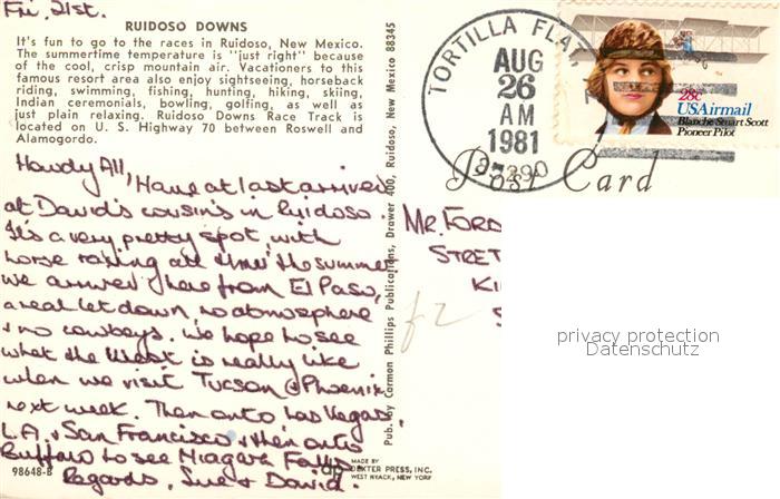 73123499 old postcard Ruidoso Downs Race Track horse races postalisch gelaufen Erhaltung siehe scans [FriedD77] KatCode: 14140330000000