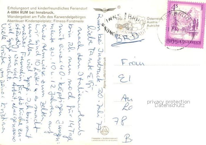 73224101 alte Postkarte Rum Tirol mit Rumerspitze Karwendelgebirge Fliegeraufnahme postalisch gelaufen Erhaltung siehe scans [FriedD77] KatCode: 11390332070346