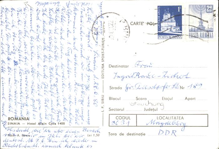 old postcard Rumaenien Sinaia Hotel Alpin Cota Seilbahn postalisch gelaufen
