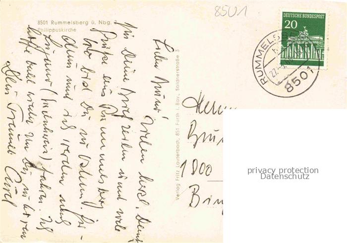 74049072 alte Postkarte Rummelsberg Schwarzenbruck Nuernberg Philippuskirche postalisch gelaufen Erhaltung siehe scans [FriedD77] KatCode: 11110009574157