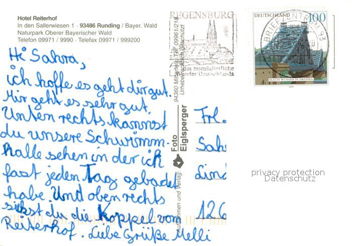 73646122 alte Postkarte Runding Cham Hotel Reiterhof Fliegeraufnahme Pony Hallenbad postalisch gelaufen Erhaltung siehe scans [WerneD78] KatCode: 11110009372155