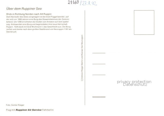 73211016 alte Postkarte Ruppin Brandenburg Fliegeraufnahme mit Ruppiner See postalisch gelaufen Erhaltung siehe scans [WerneD78] KatCode: 11110012068320