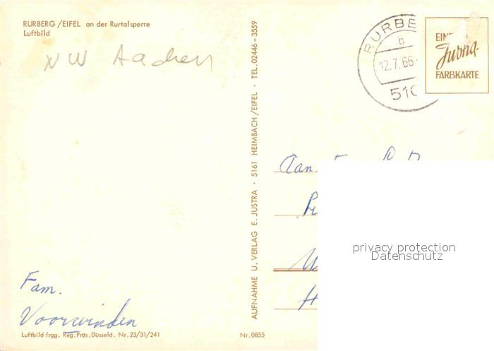 72888284 alte Postkarte Rurberg Rurtalsperre Fliegeraufnahme postalisch gelaufen Erhaltung siehe scans [FriedD77] KatCode: 11110005354028