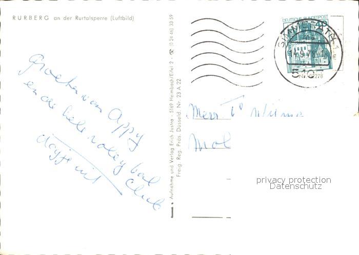 72421058 alte Postkarte Rurberg Simmerath Eifel NRW an der Rurtalsperre Fliegeraufnahme postalisch gelaufen Erhaltung siehe scans KatCode: 11110005354028