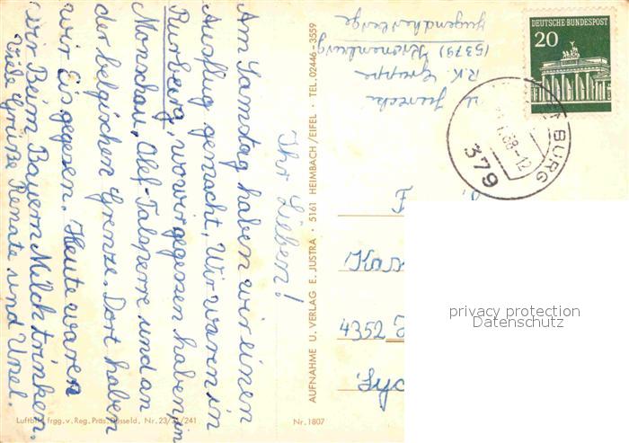72730630 alte Postkarte Rurberg Simmerath Eifel NRW Fliegeraufnahme Personenschiff Dueren Segelboote Talsperre postalisch gelaufen Erhaltung siehe scans [AndreD76] KatCode: 11110005354028
