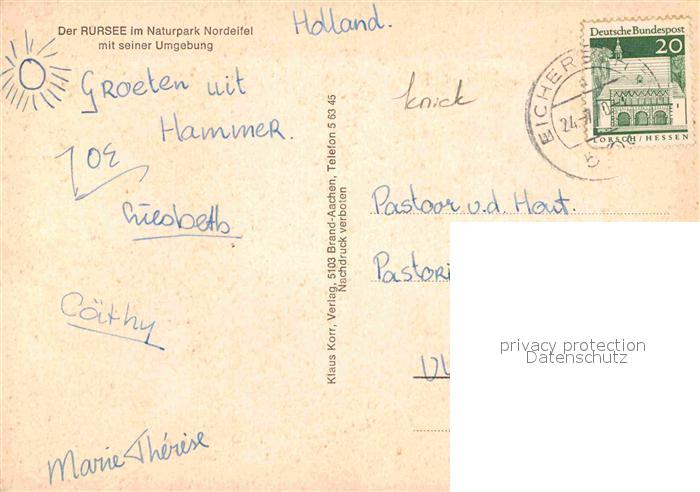 72837545 alte Postkarte Rurberg Simmerath Eifel NRW Rursee Naturpark Nordeifel Heimbach Mariawald Woffelsbach postalisch gelaufen Erhaltung siehe scans [PaolaD17] KatCode: 11110005354028