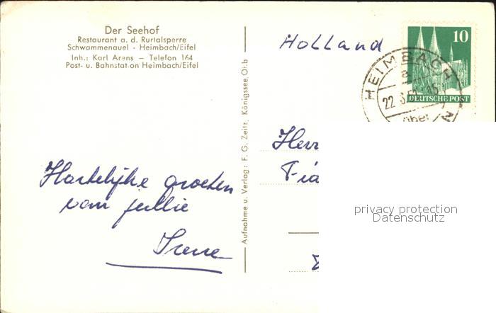 72451618 alte Postkarte Rurtalsperre Schwammenauel Der Seehof Restaurant postalisch gelaufen Erhaltung siehe scans KatCode: 11110005358012