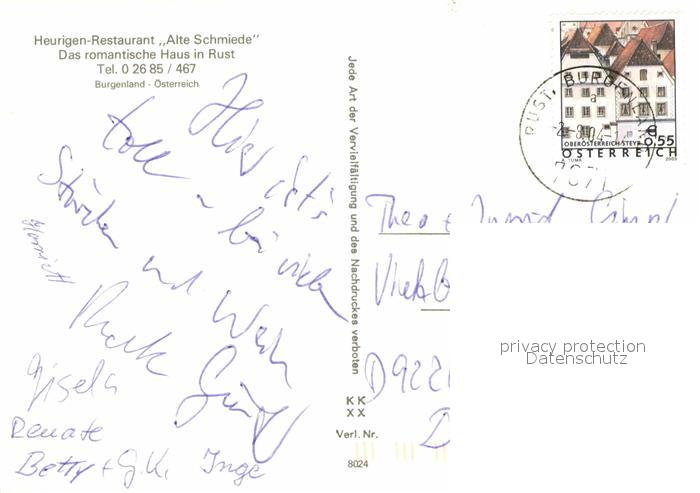 72850646 alte Postkarte Rust Burgenland Heurigen Restaurant Alte Schmiede postalisch gelaufen Erhaltung siehe scans [AndreD76] KatCode: 11390112010201