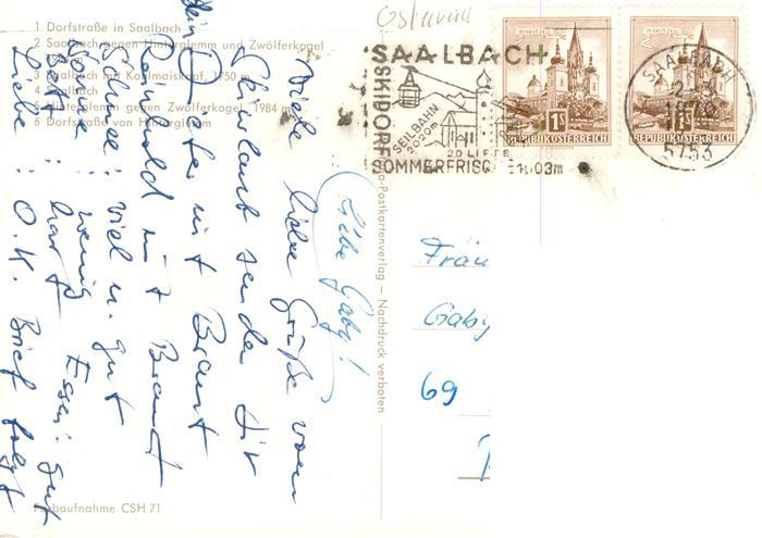 73937244 alte Postkarte Saalbach -Hinterglemm AT Dorfstrasse Panorama mit Zwoelferkogel und Kohlmaiskopf Kirche Ortsansicht postalisch gelaufen Erhaltung siehe scans [WerneD78] KatCode: 11390322050618