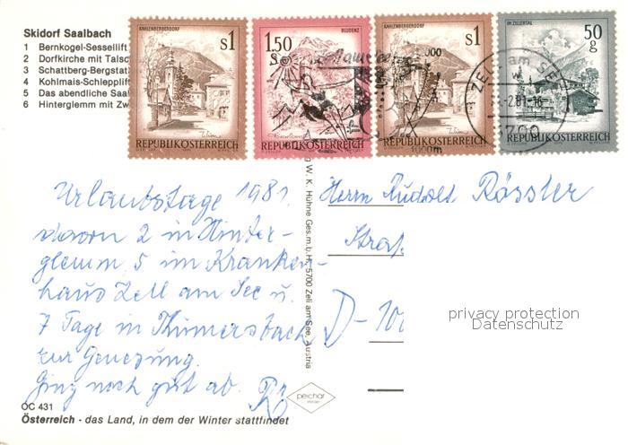73005723 alte Postkarte Saalbach-Hinterglemm Bernkogel Sessellift Dorfkirche Schattberg Station Kohlmais Schlepplift Panorama Hinterglemm postalisch gelaufen Erhaltung siehe scans [WerneD78] KatCode: 11390322050618