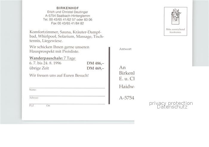 72613303 Saalbach-Hinterglemm Birkenhof postalisch nicht gelaufen Werbekarte (keine Postkarte) Erhaltung siehe scans [AndreD76] KatCode: 11390322050618
