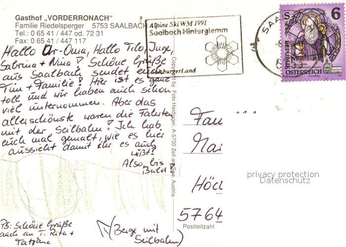 73524075 alte Postkarte Saalbach-Hinterglemm Gasthaus Vorderronach Seilbahn postalisch gelaufen Erhaltung siehe scans [LiesaD40] KatCode: 11390322050618
